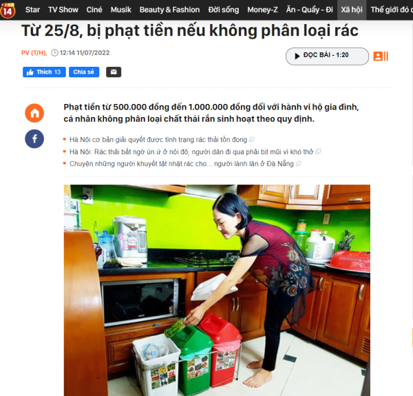 日常生活ごみを規定通りに分類しなかった場合、家庭及び個人に対して500,000VND(約2500円)~1,00,000,000VND(約500万円)の罰金となるとの事です。